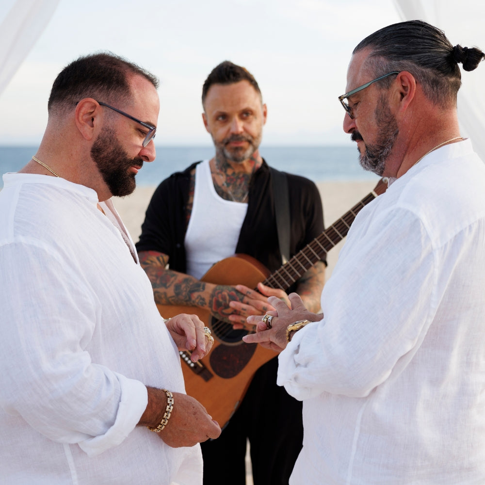 The Blue October Cabo Wedding & Vow Renewal Experience is a 15-minute beachfront ceremony designed to be intimate, personal, and completely unforgettable. Justin will officiate your ceremony and close it with a live acoustic performance of your favorite Blue October song.
